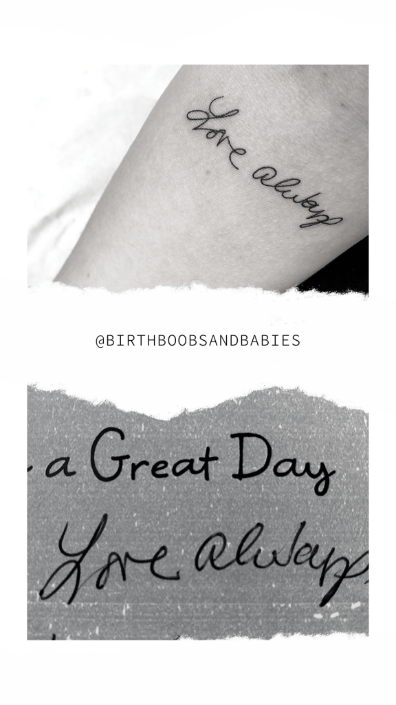 I always loved her handwriting, I used to copy it as a child…And then as a teenager to get out of class. ha. It was so uniquely hers, and I loved it. I still do. I knew I needed it close to me, forever. I found a card that she had given my husband on Father’s Day just before she died. It was the only card I hadn’t thrown out. The only one…Let’s talk about guilt. For the record, don’t get rid of all the cards from your loved ones.. keep some. You will feel intense regret when they’re gone if you do. Fortunately, my amazing husband saved it and it ended “love always” and I knew that was all I needed. I had it tattooed on my arm, and I can see her handwriting every day. I look at my tattoo and my heart skips a beat, but in a good way. I have never felt as complete without her as I do with it on my arm. The funniest part about my tattoo is how much she hated them. I like to believe she would have loved this one because of the comfort it gives me. Or maybe because it was about her. Let’s not kid ourselves, she probably would have loved that part most of all.